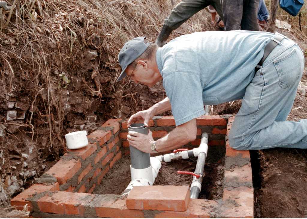 Left: Charlie Taflin, water engineer and inventor of The Manual Chlorinator inspecting the tablet tube that holds the solid chlorine tablets in the Chlorinator. When installed in a drinking water system, the Chlorinator eliminates bacteria harmful to humans.