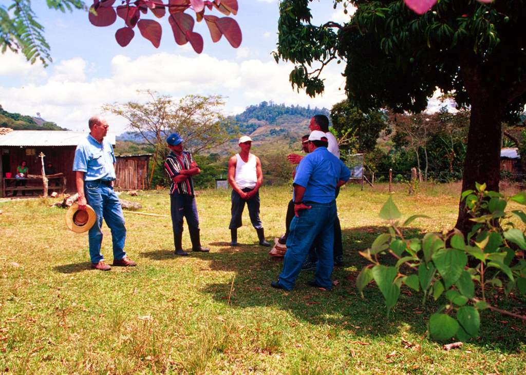 Charlie Taflin (l.) and Fred Jacob (far right), co-inventors of The Manual Chlorinator for decontaminating drinking water in rural water systems as well as being TASCA Board of Directors members. Here they are discussing the advantages of chlorinated water with community Water and Sanitation Committee (CAPS) members. Jinotega, Nicaragua 2003.