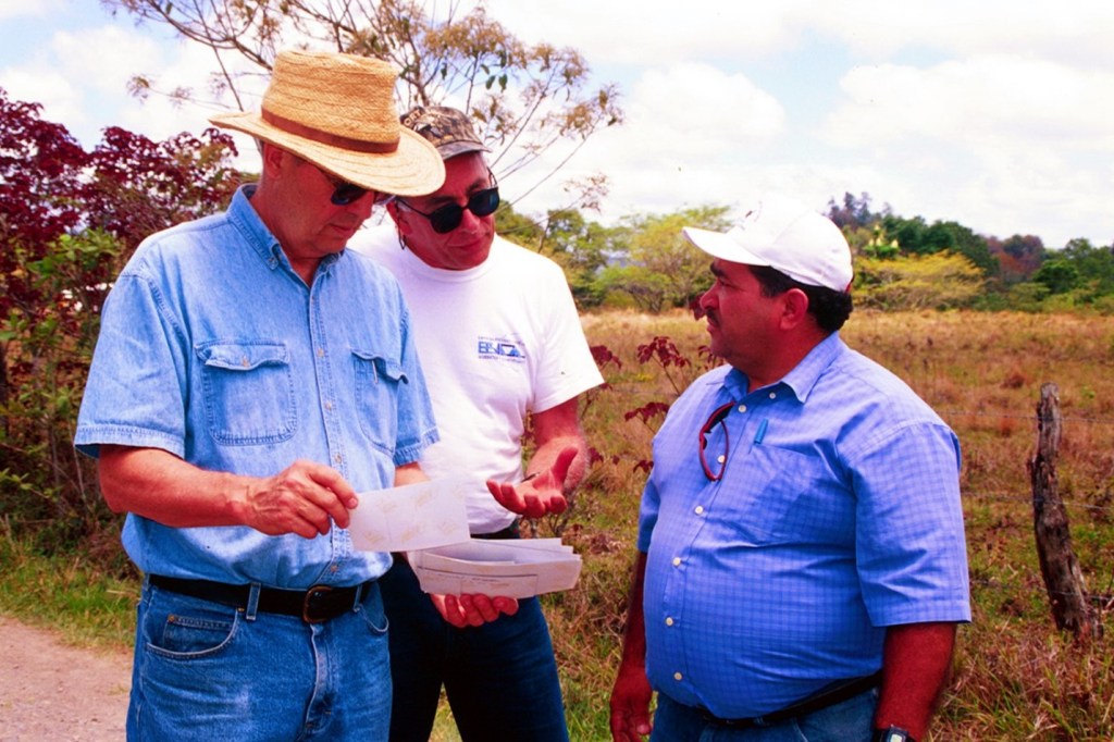 Board members Charles Taflin (Left) Technical Advisor and Fred Jacob President (center) the co-inventors of The Manual Chlorinator, discussing a chlorinator installation with water technician Ramon Castillo (right) Matagalpa, Nicaragua. 2003.